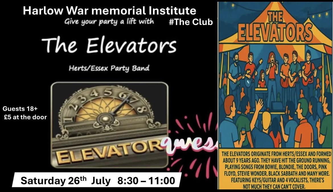 Saturday 26th July at Harlow War Memorial Snooker & Social Club we have The Elevators singing songs from Pink, Stevie Wonder, Bowie, Blondie, Doors and so many more